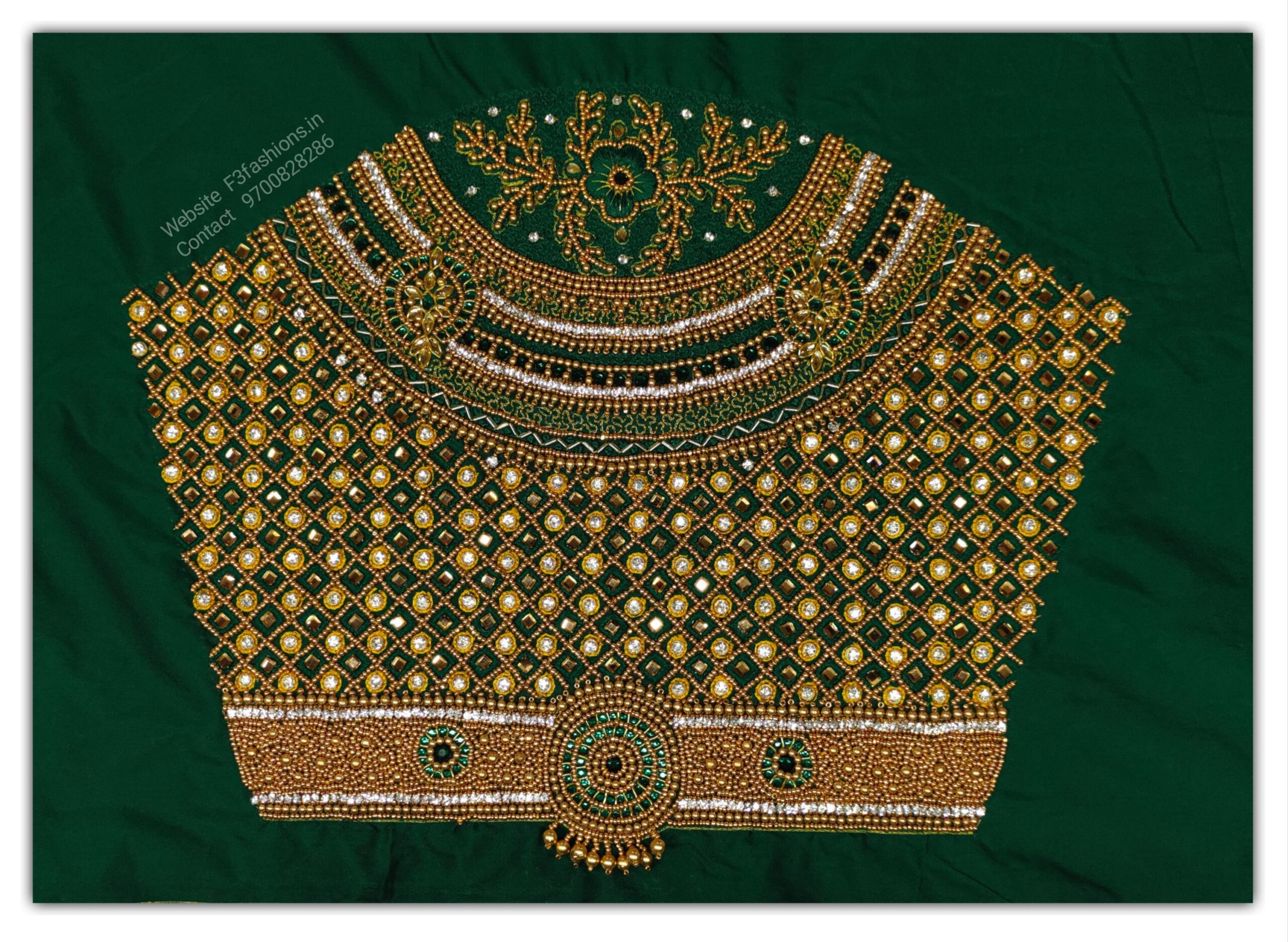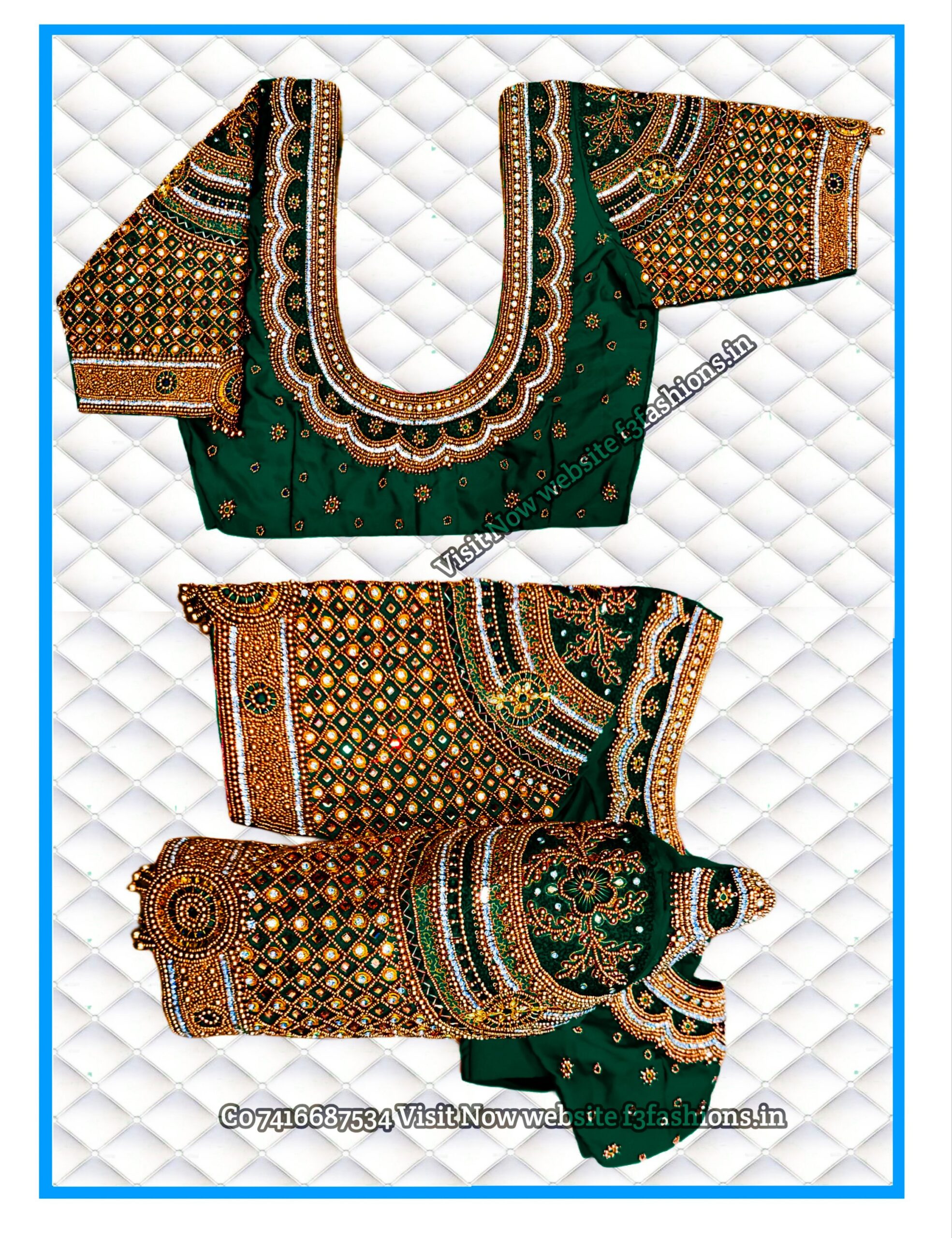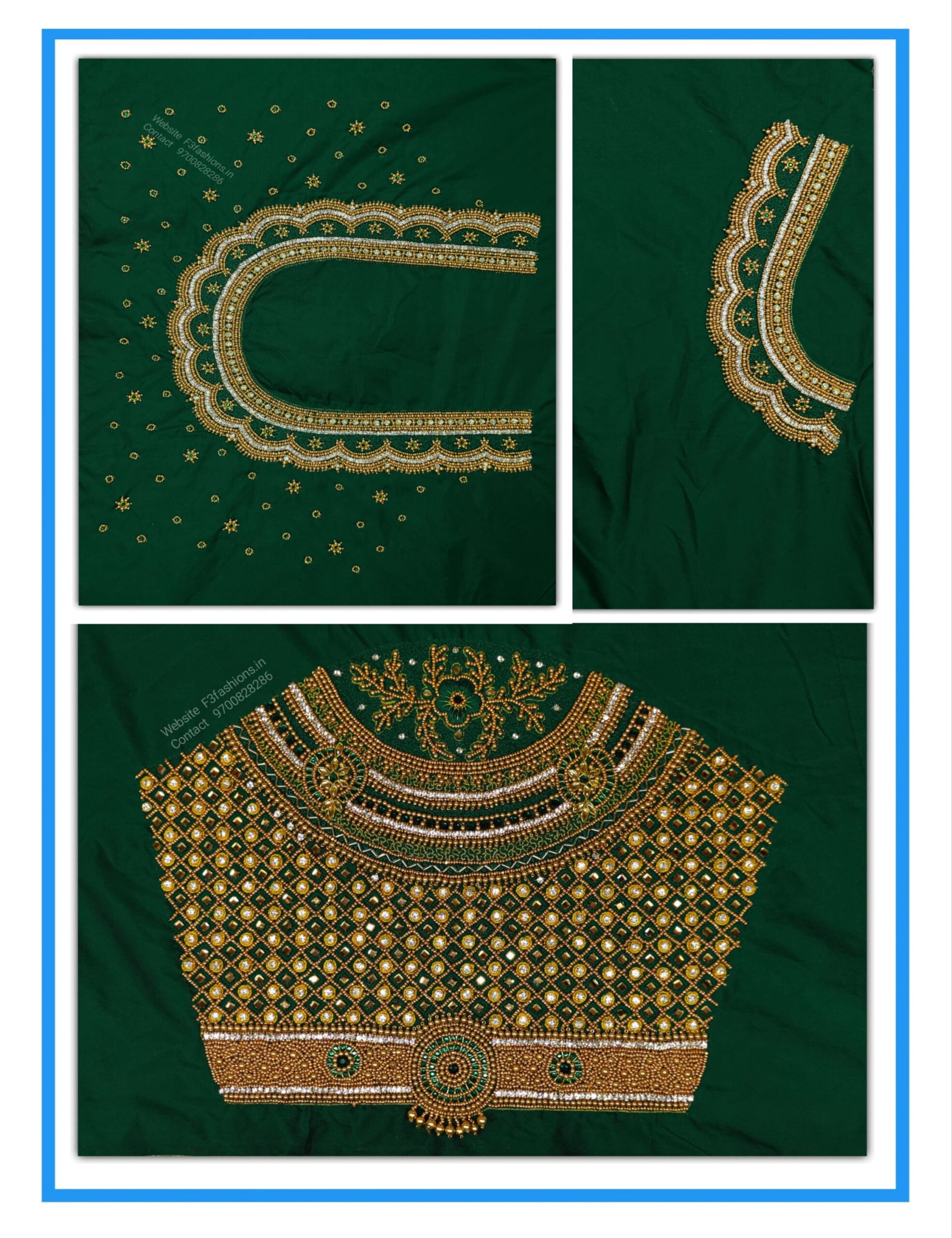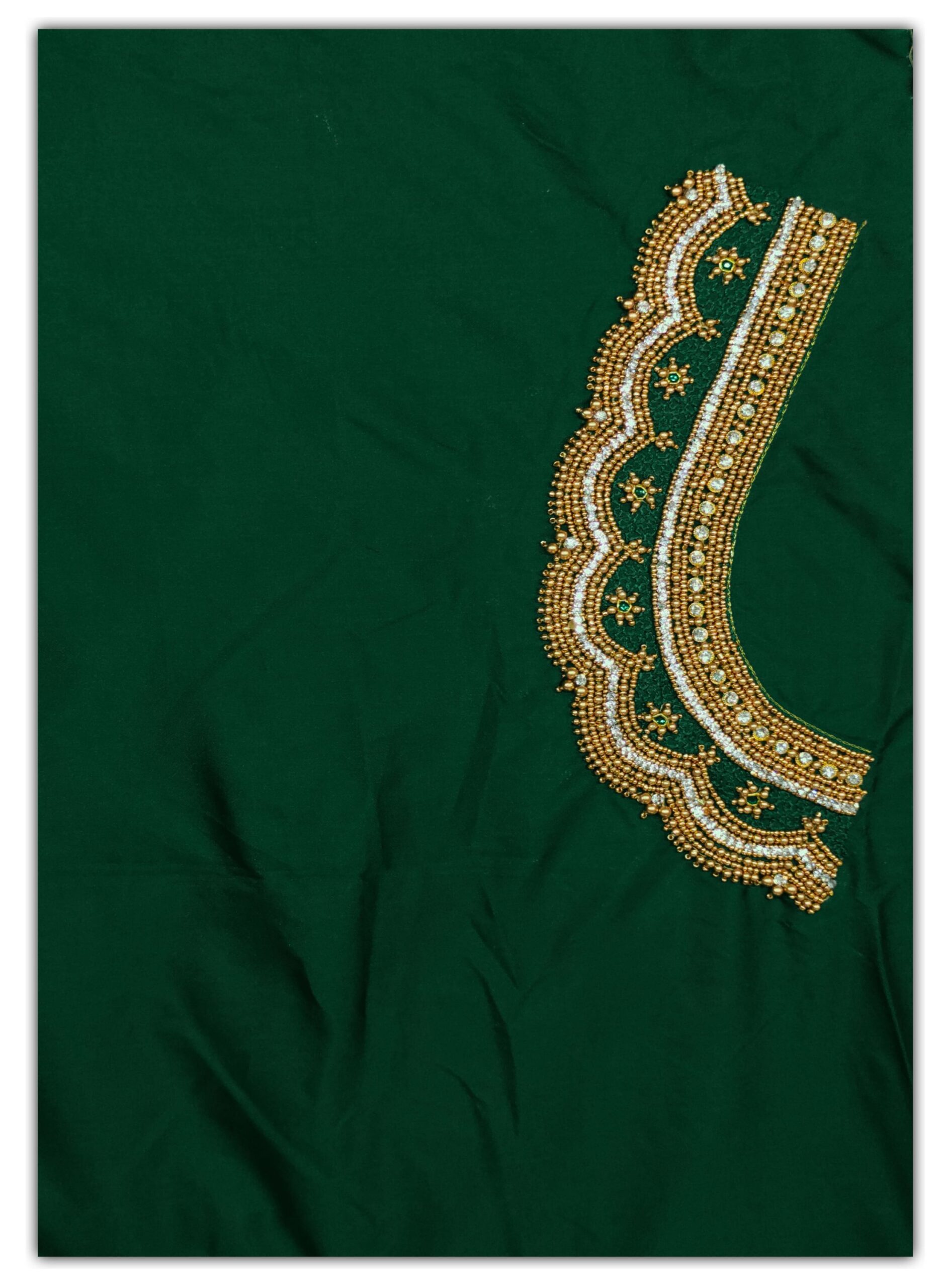 Dark Green Blouse Self And Gold Combination unstitched blouse We bring to you this blouse which is designed for women and is made from half pattu, cotton silk fabric. It is available in a set of attractive colors. The design on the blouse is a type of intricate design stitch known as maggam work. It is available in an unstitched form and can be stitched according to your preference and style