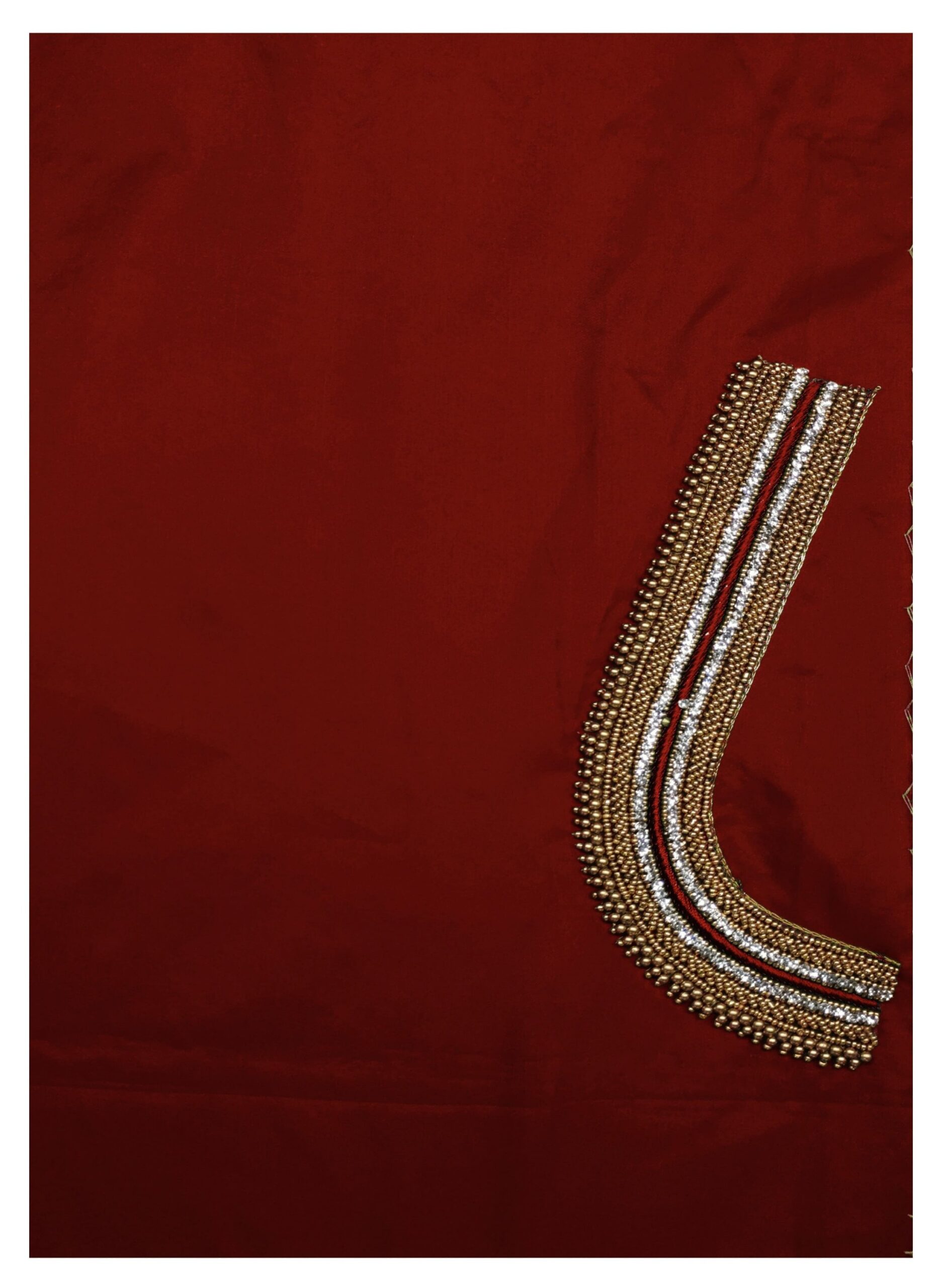 Dark Red Blouse, Self And Gold Combination unstitched blouse We bring to you this blouse which is designed for women and is made from half pattu, cotton silk fabric. It is available in a set of attractive colors. The design on the blouse is a type of intricate design stitch known as maggam work. It is available in an unstitched form and can be stitched according to your preference and style