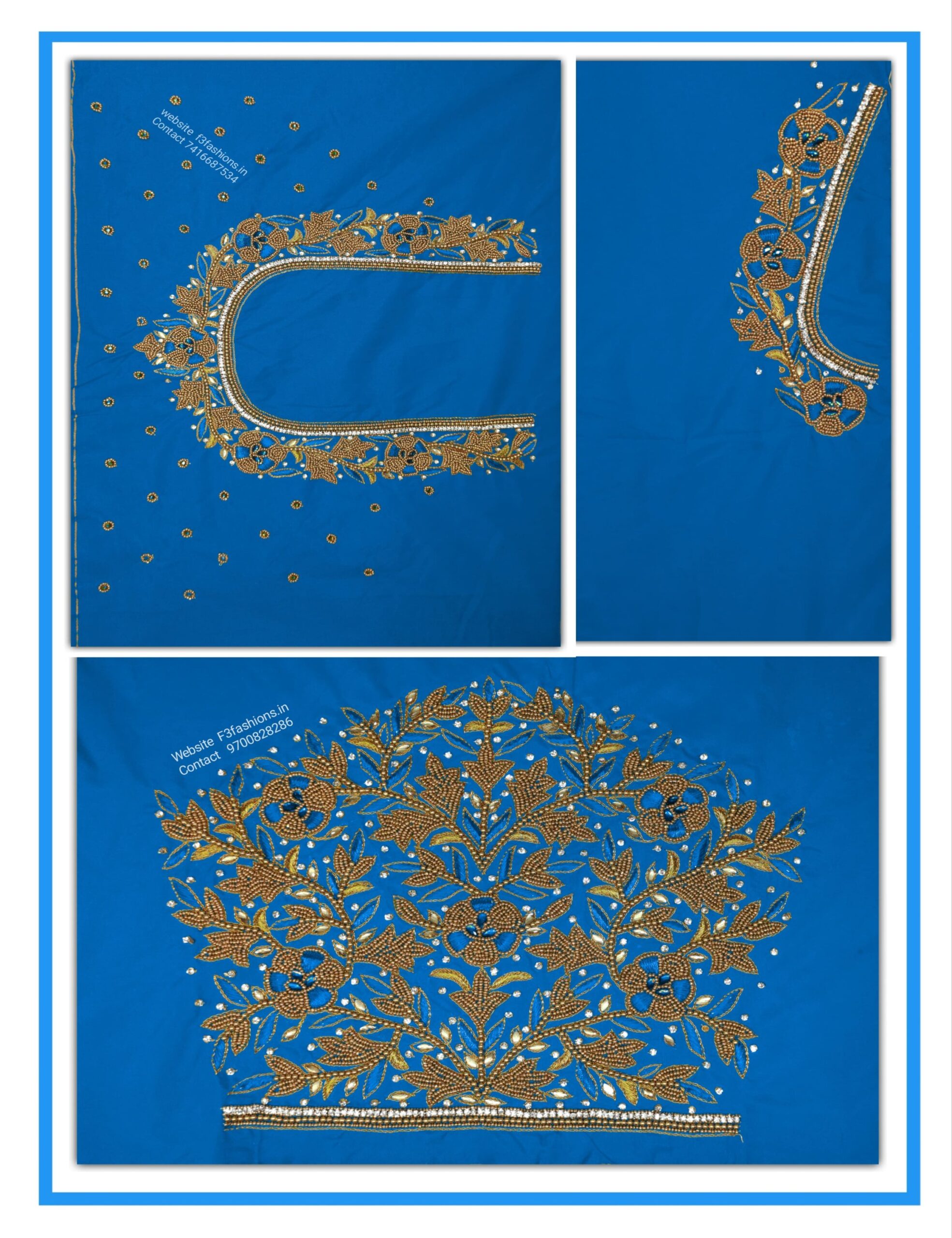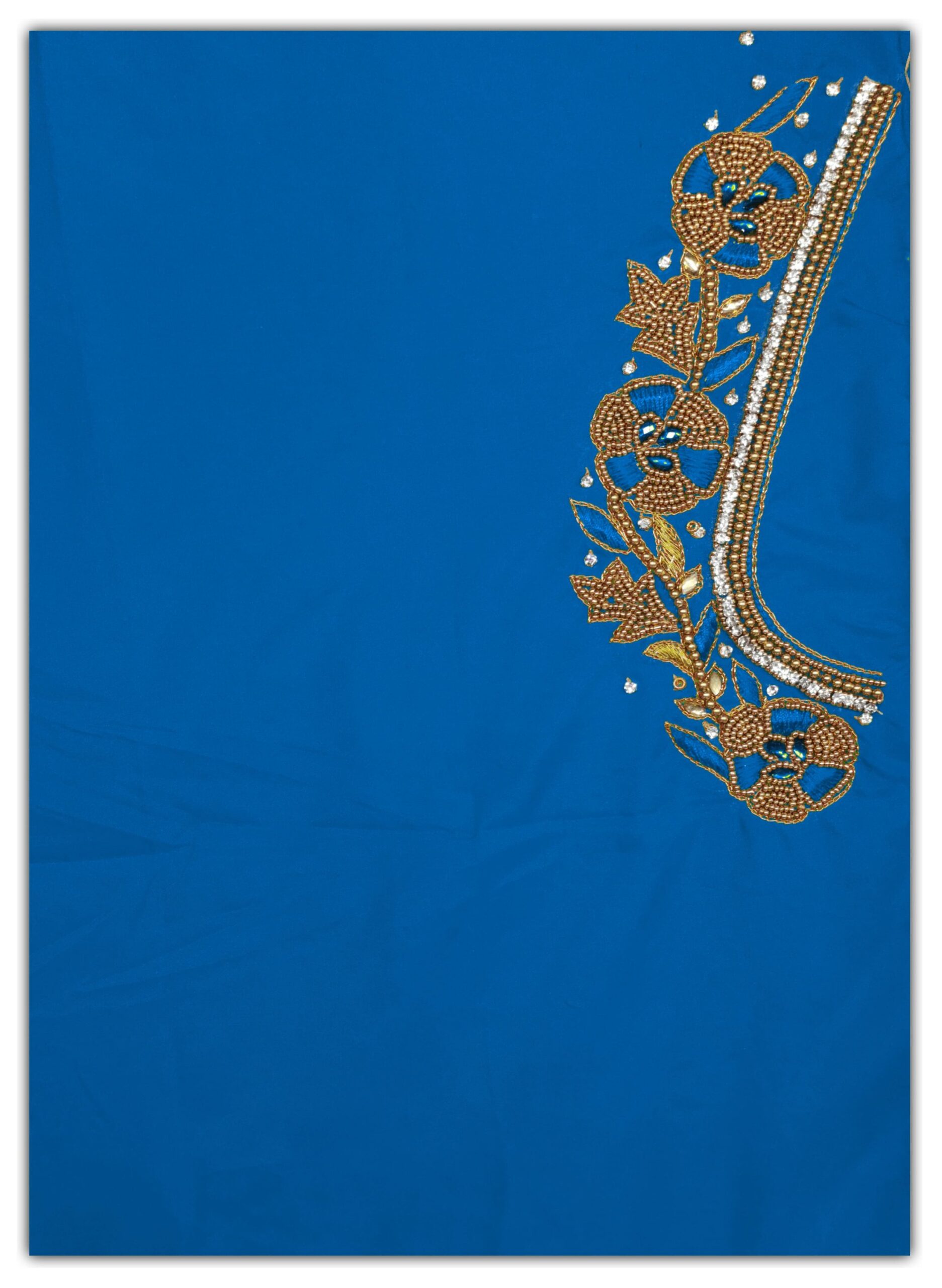 Light Blue Blouse Self And Gold Combination unstitched blouse We bring to you this blouse which is designed for women and is made from half pattu, cotton silk fabric. It is available in a set of attractive colors. The design on the blouse is a type of intricate design stitch known as maggam work. It is available in an unstitched form and can be stitched according to your preference and style