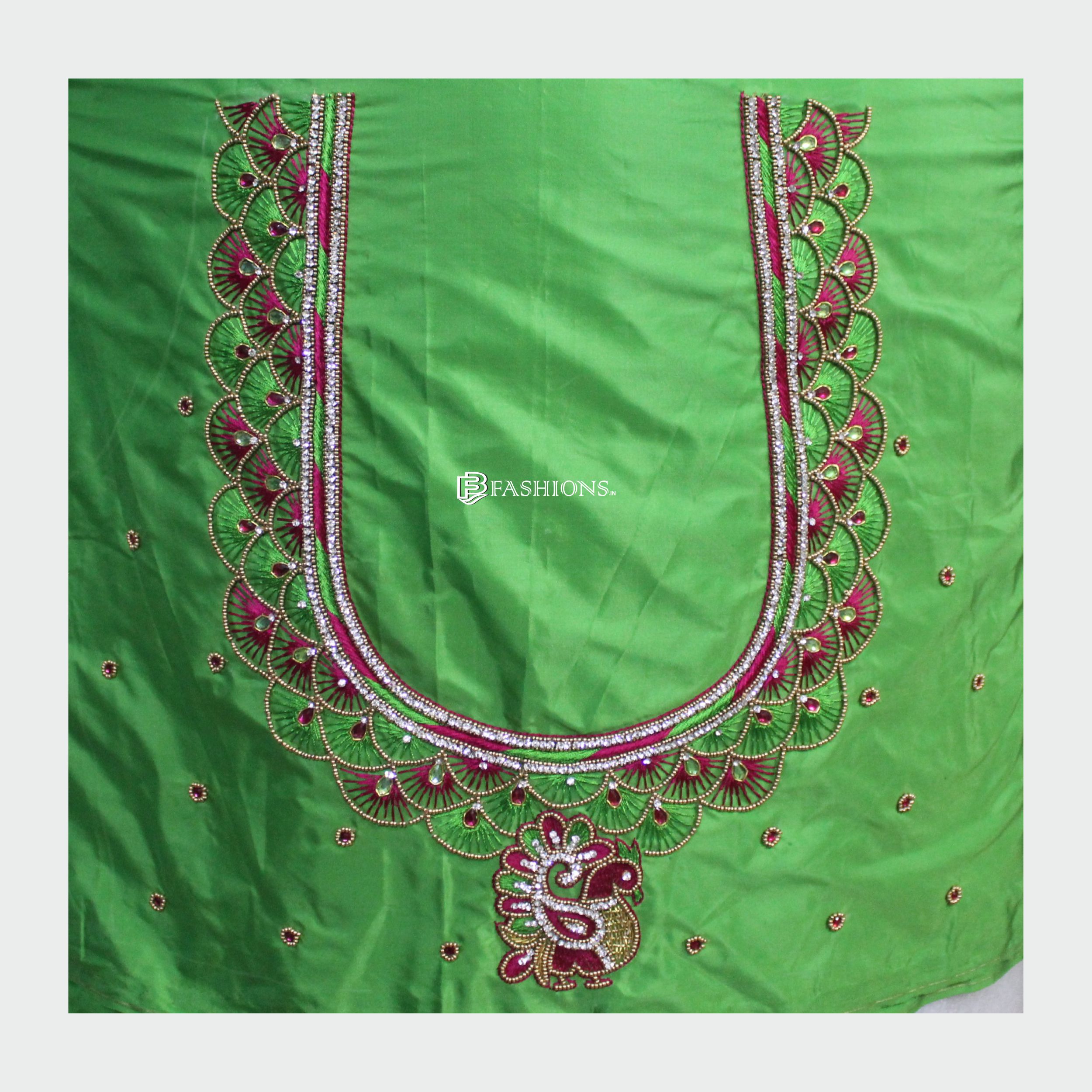 Parrot Green Colour Peacock Flower Water Work Design Maggam Work Blouse