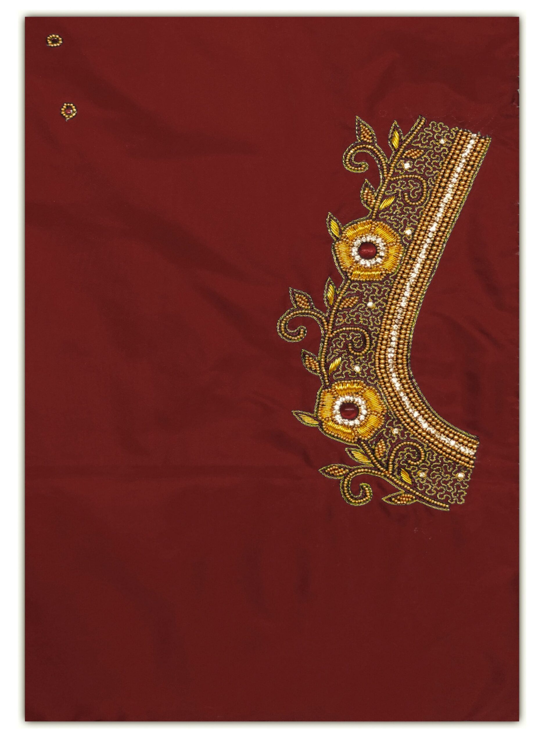 Maroon Blouse, Self And Gold Combination unstitched blouse We bring to you this blouse which is designed for women and is made from half pattu, cotton silk fabric. It is available in a set of attractive colors. The design on the blouse is a type of intricate design stitch known as maggam work. It is available in an unstitched form and can be stitched according to your preference and style