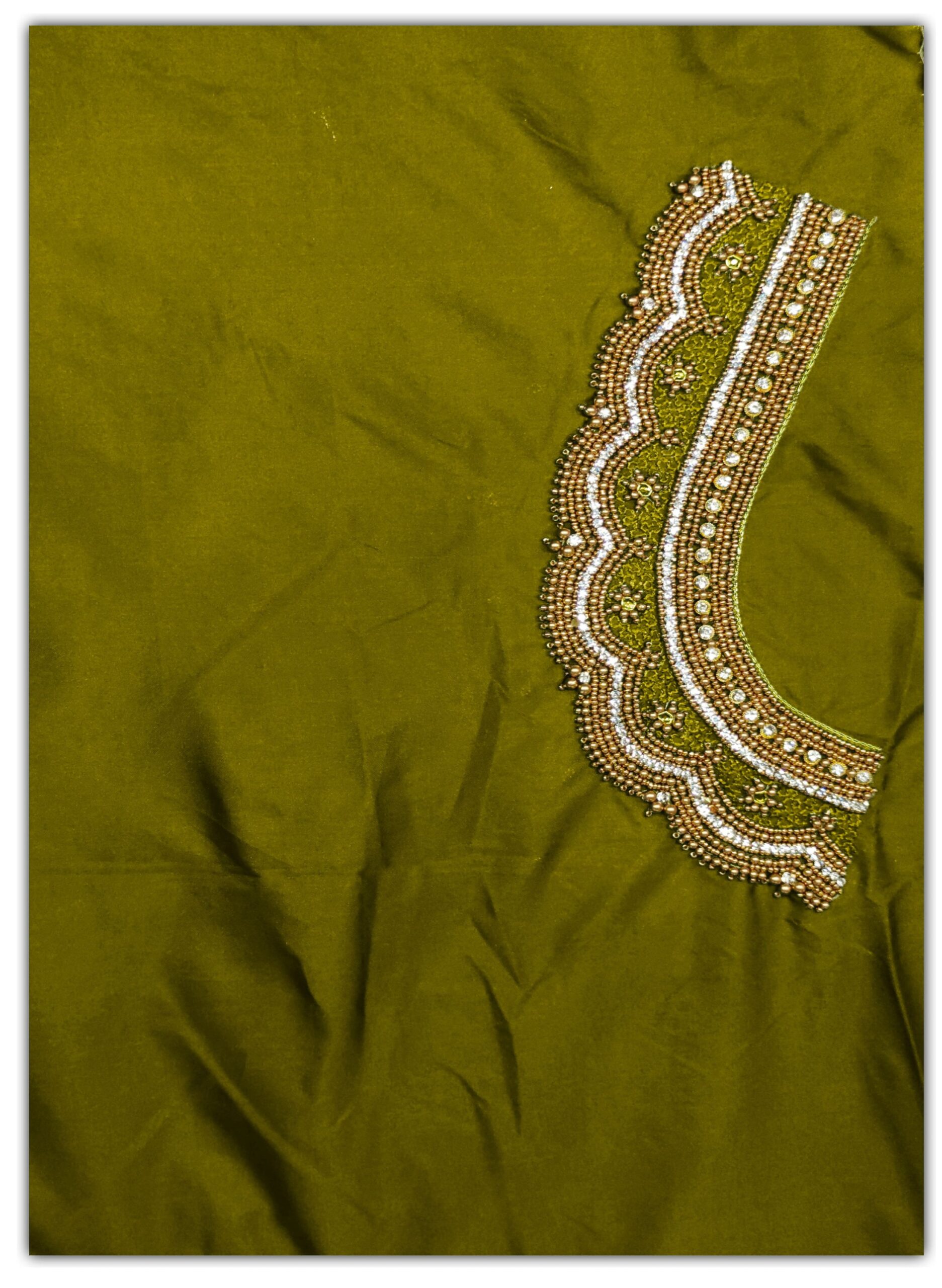 Mehendi Blouse, Self And Gold Combination unstitched blouse We bring to you this blouse which is designed for women and is made from half pattu, cotton silk fabric. It is available in a set of attractive colors. The design on the blouse is a type of intricate design stitch known as maggam work. It is available in an unstitched form and can be stitched according to your preference and style