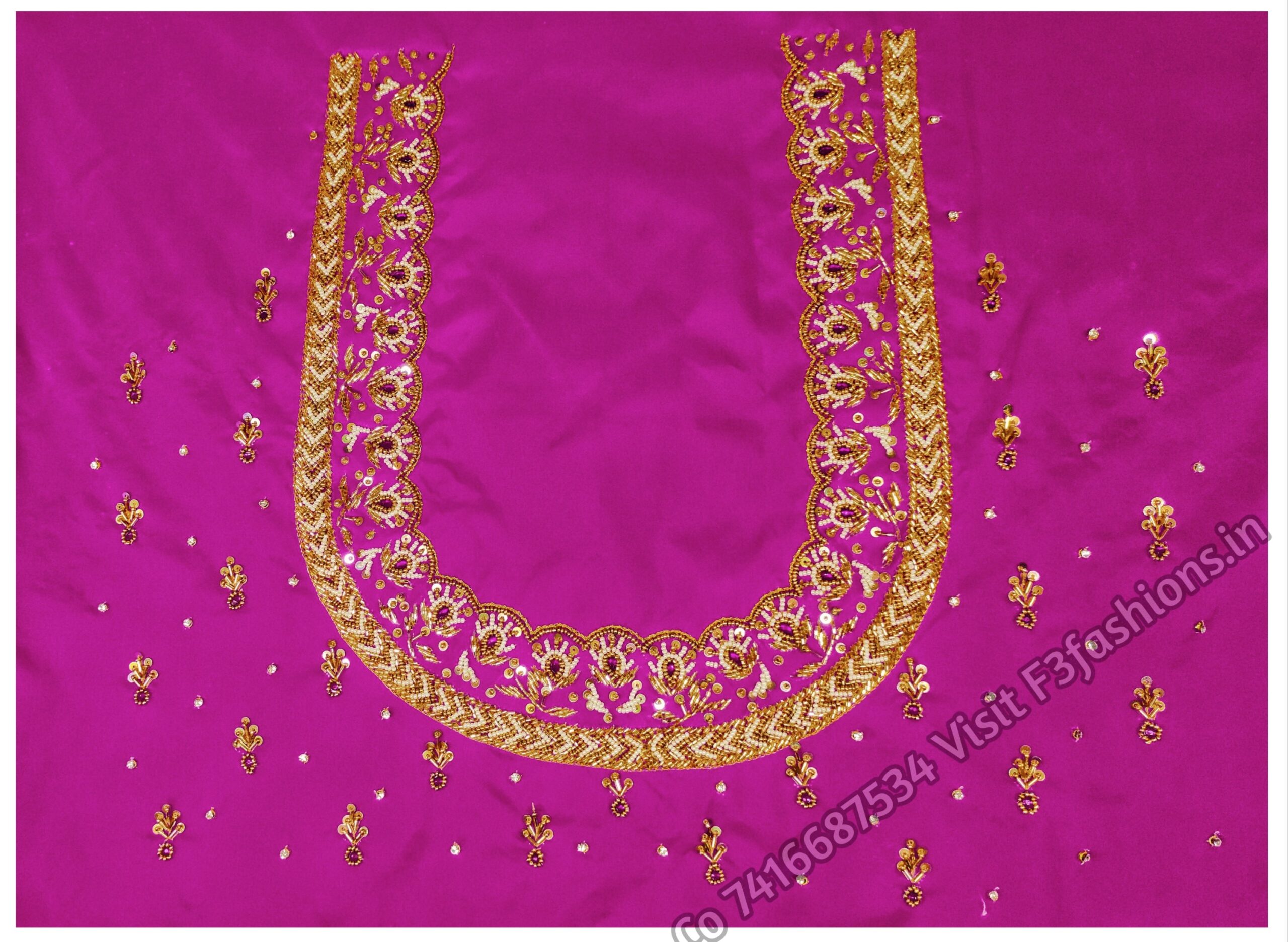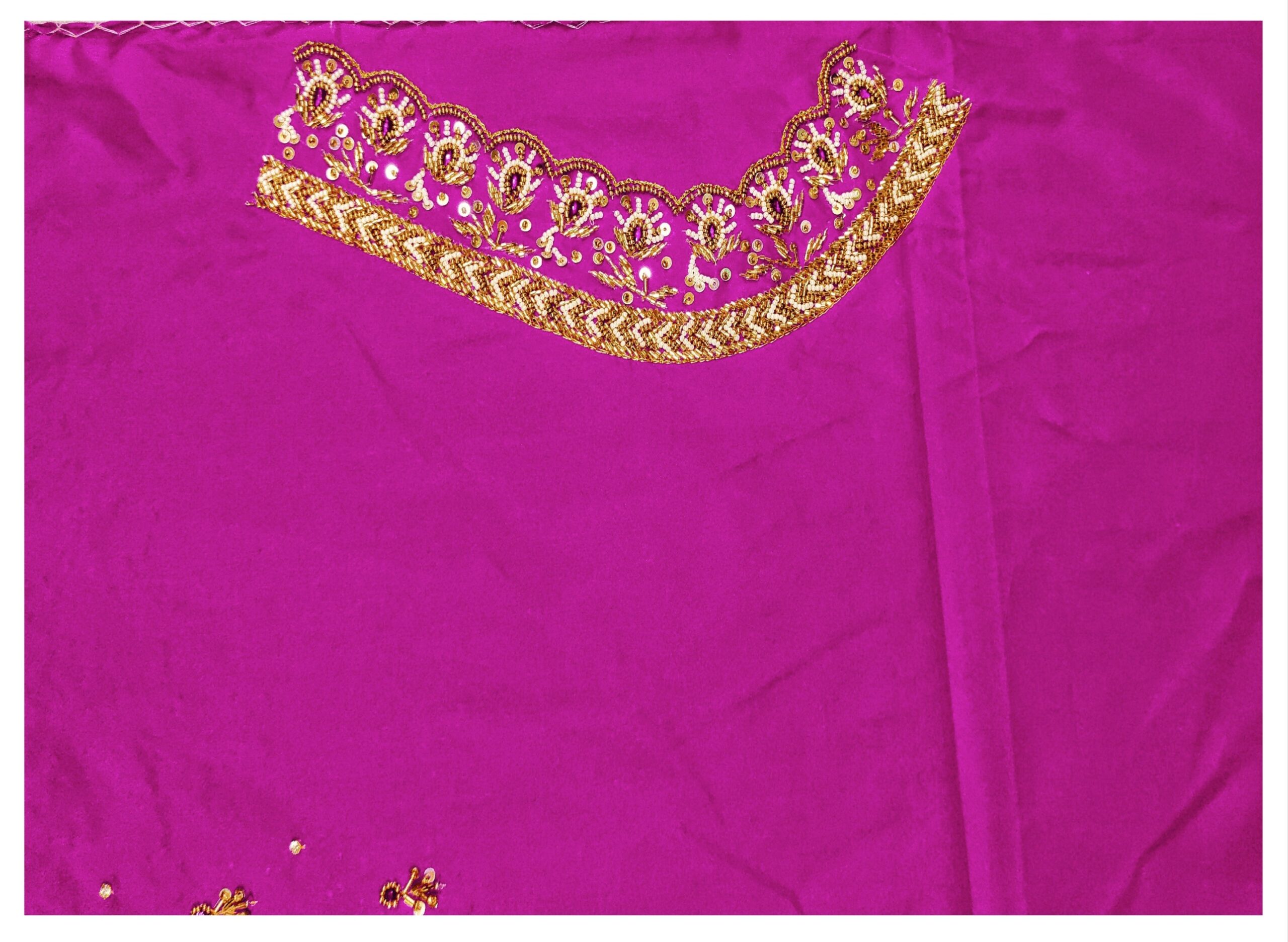 Rani Pink Cloth Self And Gold Combination unstitched blouse We bring to you this blouse which is designed for women and is made from half pattu, cotton silk fabric. It is available in a set of attractive colors. The design on the blouse is a type of intricate design stitch known as maggam work. It is available in an unstitched form and can be stitched according to your preference and style