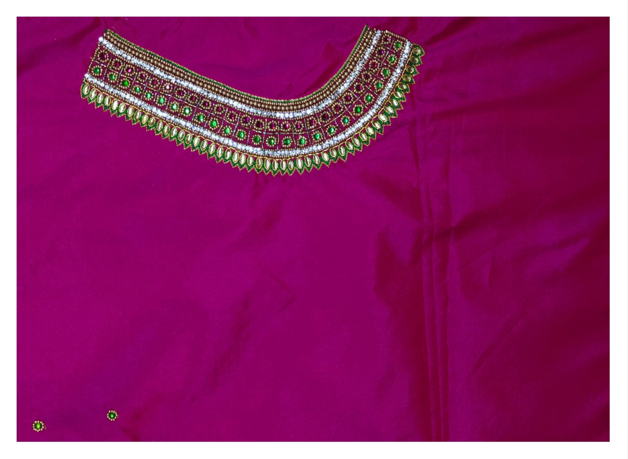 Rani Pink Cloth Green Combination unstitched blouse We bring to you this blouse which is designed for women and is made from half pattu, cotton silk fabric. It is available in a set of attractive colors. The design on the blouse is a type of intricate design stitch known as maggam work. It is available in an unstitched form and can be stitched according to your preference and style