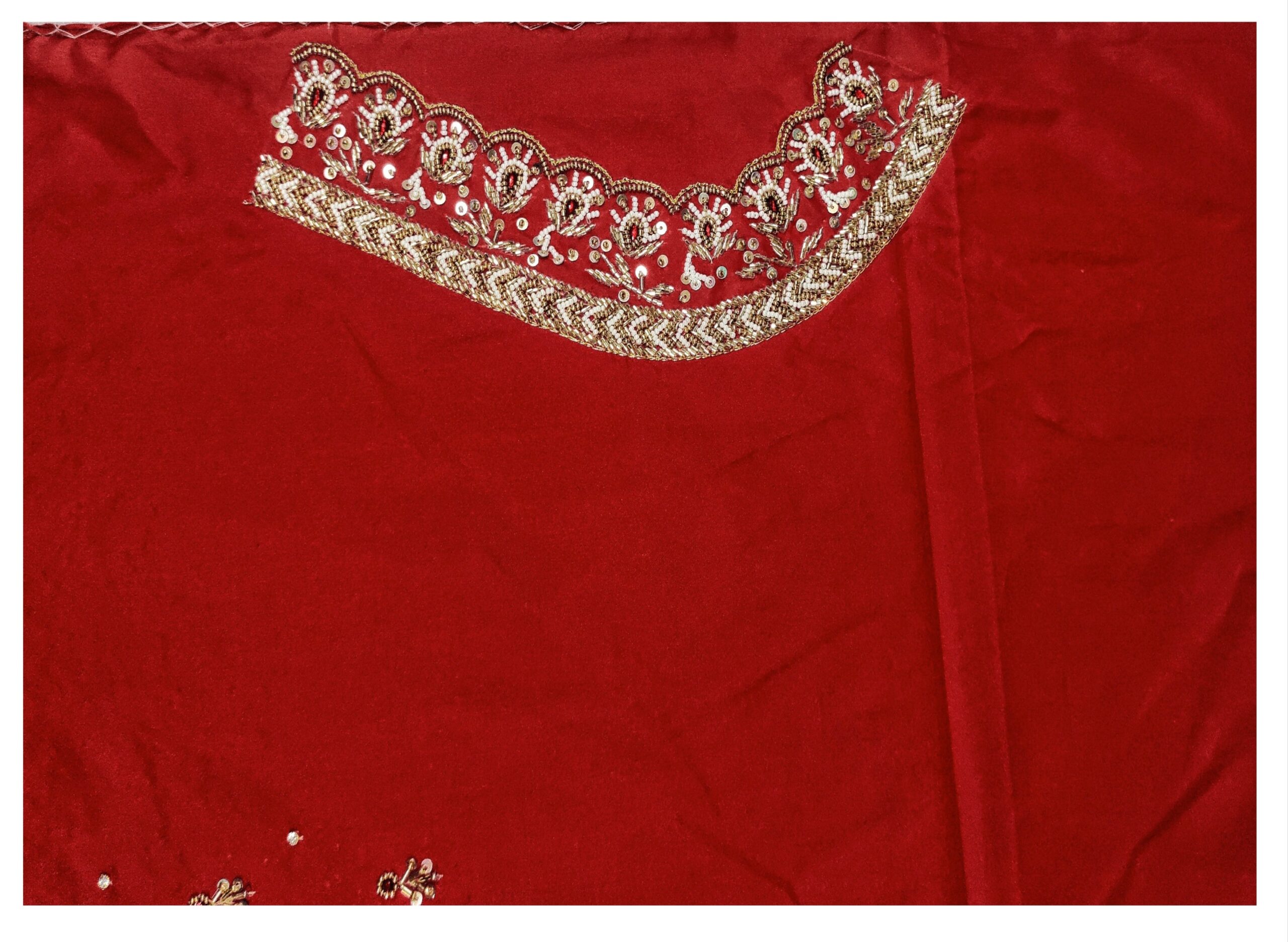 Red Cloth Self And Gold Combination unstitched blouse We bring to you this blouse which is designed for women and is made from half pattu, cotton silk fabric. It is available in a set of attractive colors. The design on the blouse is a type of intricate design stitch known as maggam work. It is available in an unstitched form and can be stitched according to your preference and style